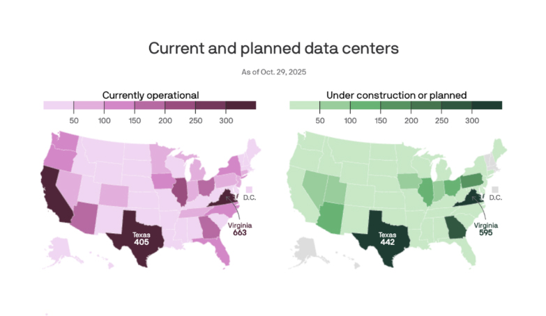 Key growth hotspots from 2025 data include Virginia with 663 operational and 595 planned/under construction; Texas with 405 operational and 442 planned; California with 319 operational, and Georgia with 162 operational and 285 planned .3
